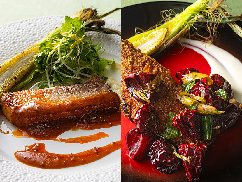 ランチコースの「北海道産豚の粒マスタードソース炒め」(写真左)は、粒マスタードとラー油を合わせたソースが、甘みのある豚肉の味わいを引き立てます。ディナーコースでお選びいただける「ラム肉の四川唐辛子炒め クミン風味」(写真右)は、ジューシーでやわらかなラム肉に、四川唐辛子とクミンの爽やかな辛味が調和した、香り豊かな一品です。