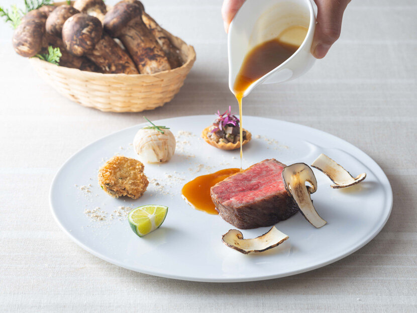 初秋のメニュー"ノルマンディー編"は、「牛肉の塩漬け ポルチーニムース リンゴのソースを忍ばせて」(写真)をご用意いたします。ノルマンディー地方の名産品として知られる"リンゴ"をソースの主役に用いた、華やかな一品。芳醇な香りのポルチーニ茸のムースにナイフを入れると、リンゴの甘味に黒胡椒やクローブスなどのスパイスを効かせたソースが、とろりと流れ出します。柔らかく塩漬けした牛肉、茸パウダーの香りを纏ったジャガイモのガレットなどとご一緒に、お楽しみください。