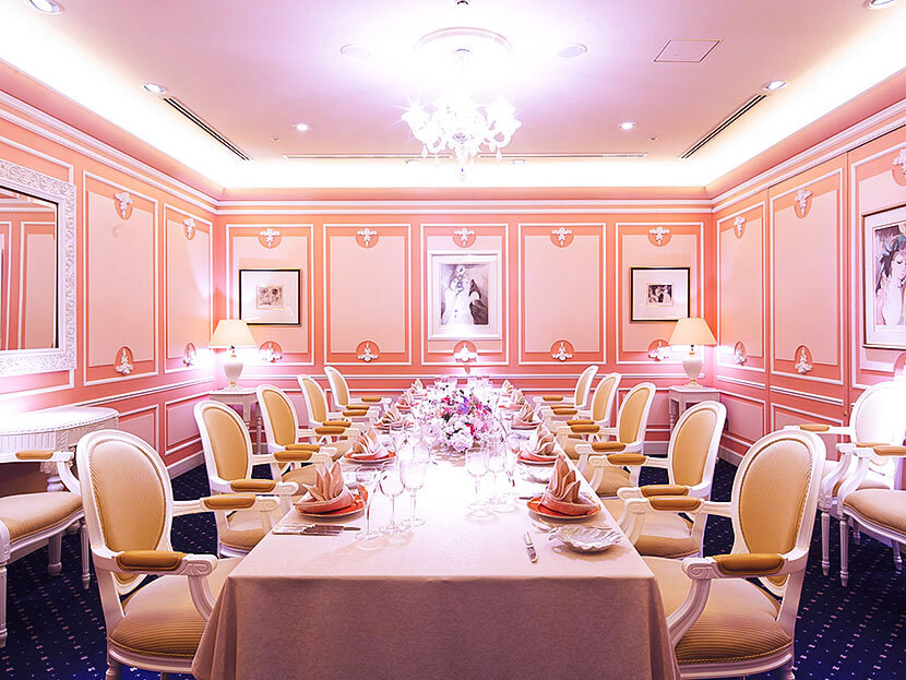 パステルピンクで統一されたヨーロピアンスタイルの室内は、マリー・ローランサンの絵画が飾られたプライベートミュージアム。お食事はもちろん、その豪華なインテリアでも最高のひとときをご提供します。